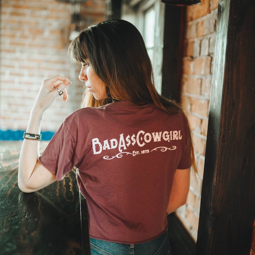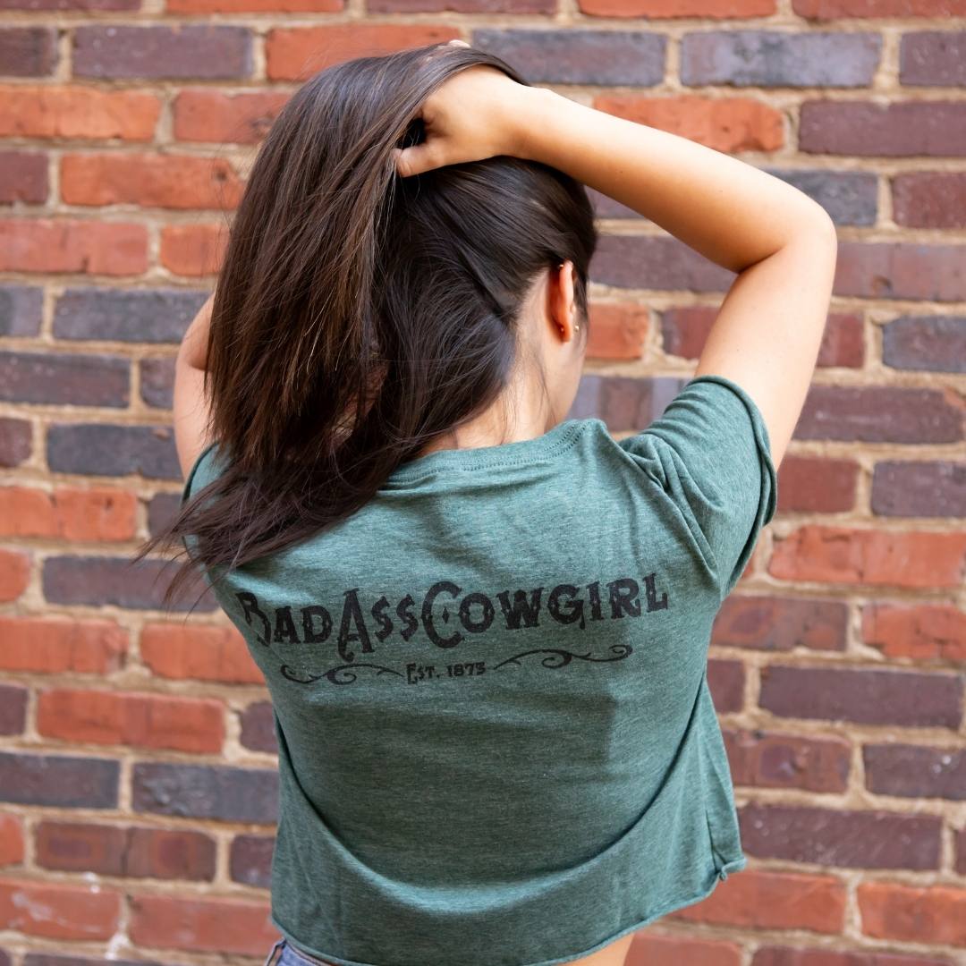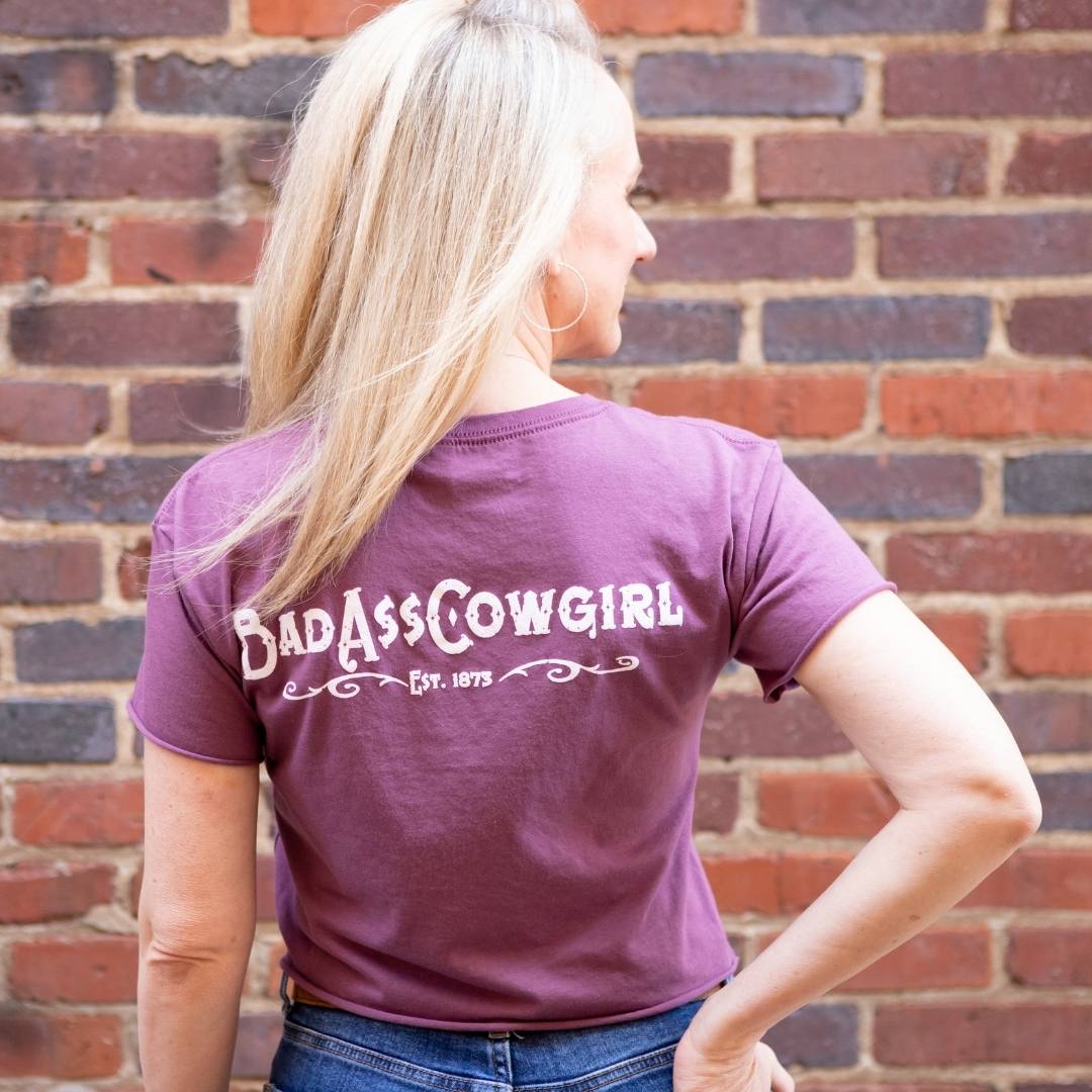 Bad Ass Cowgirl Crop Top in Black, Royal Pine Green and Shiraz Purple Small Front Logo and Large Back Logo
