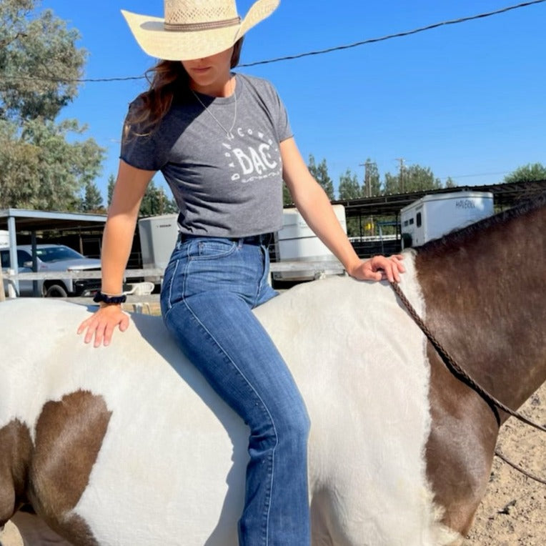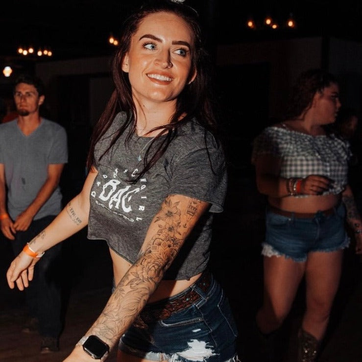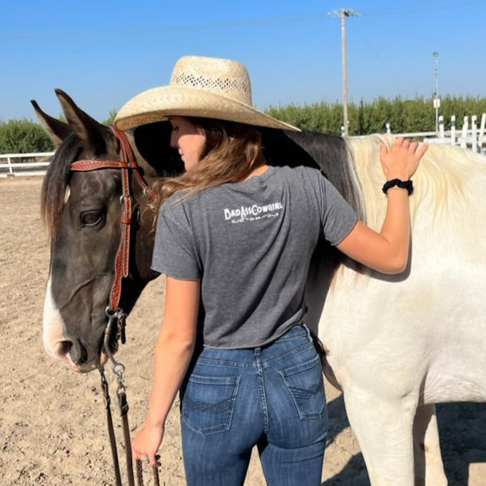 Bad Ass Cowgirl Crop Top in Heather Charcoal Large Front Logo and Small Back Logo