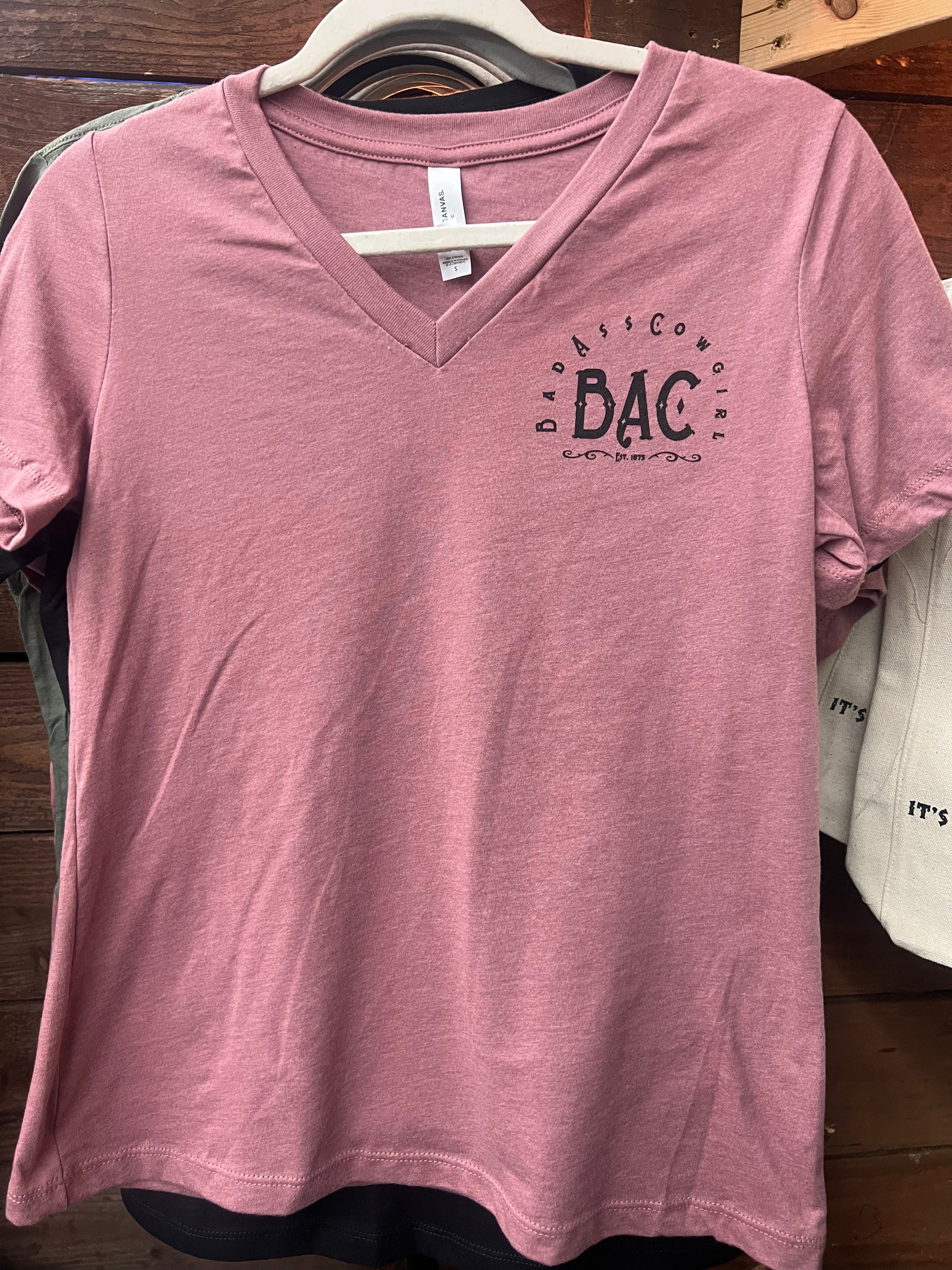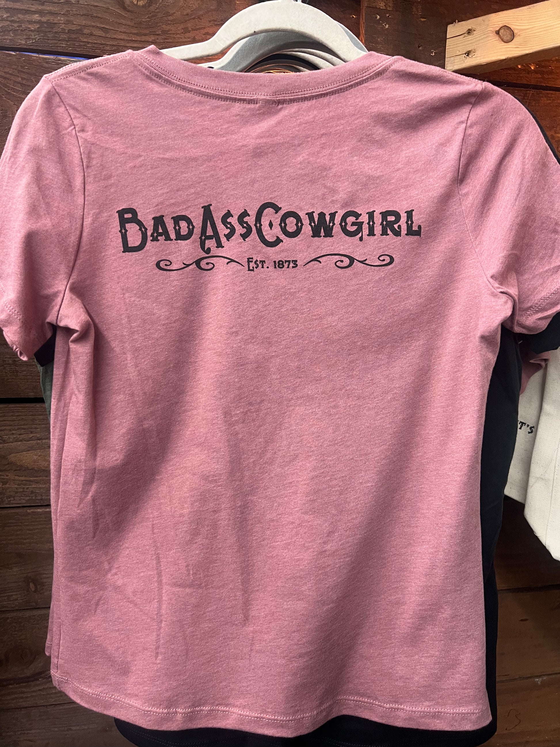 Bad Ass Cowgirl V-Neck Tee in Black, Military Green, and Mauve (Regular Fit)